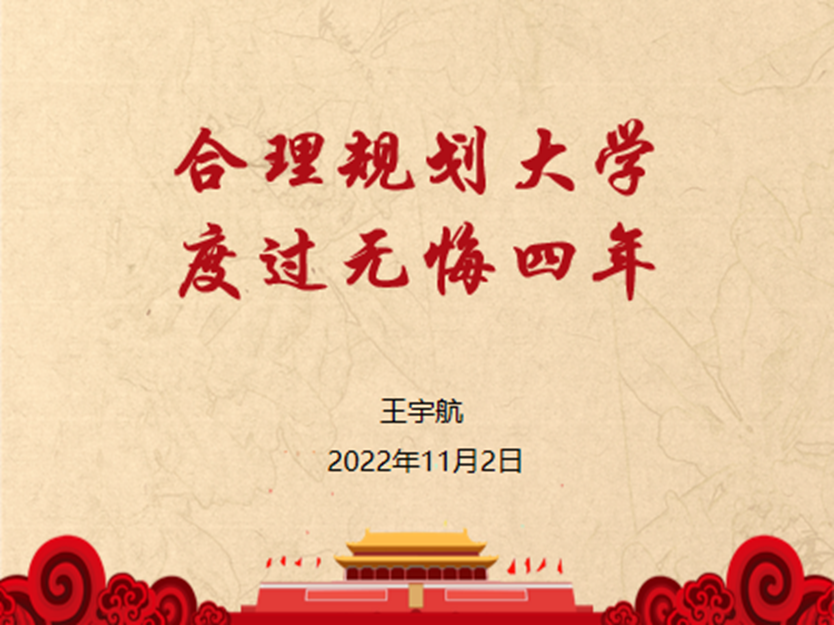 (通讯员 陈锦/图 陈锦 邱语嫣/文)怎么合理安排老员工活,如何坚持住最初的梦想?为营造积极健康的学习生活环境,帮助大一新生更快适应老员工活的角色转换,十一月二日晚七点,太阳集团tcy8722本科生党支部副书记王宇航同学,以腾讯会议的形式开展了以“合理规划大学,度过无悔四年”为主题的导师组讲座。本次讲座由员工辅导员黄鹏老师主持,全体22级同学参加。