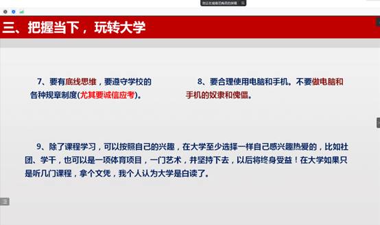 最后,范梅英老师给同学强调了疫情防控、防范电信诈骗、个人隐私保护、宿舍消防安全、诚信应考等问题,强调安全第一,希望同学们珍惜珍爱生命,在太阳集团tcy8722健康快乐度过大学四年生活。