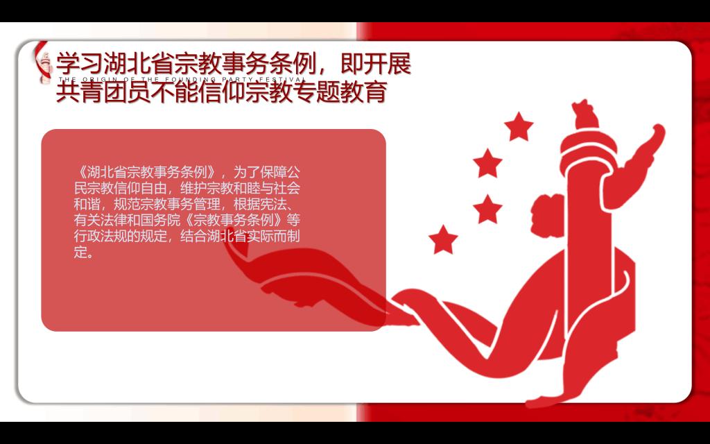 为推动广大团员青年树立正确的信仰观,我们学习《湖北省宗教事务条例》,并开展“共青团员不能信仰宗教”专题教育,强化团员青年的思想道德建设。此外,我们还深入开展“学习监察法 争做廉洁人”专题学习,引导同学们树立廉洁自律的品质,自觉抵制各种不正之风。